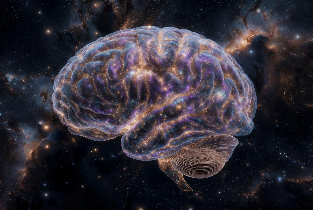 - Roughly 70–80% of each system’s mass/energy plays a “passive” role: dark energy and dark matter in the universe; water and glial support in the brain. Only 20–30% consists of active nodes (galaxies/neurons).