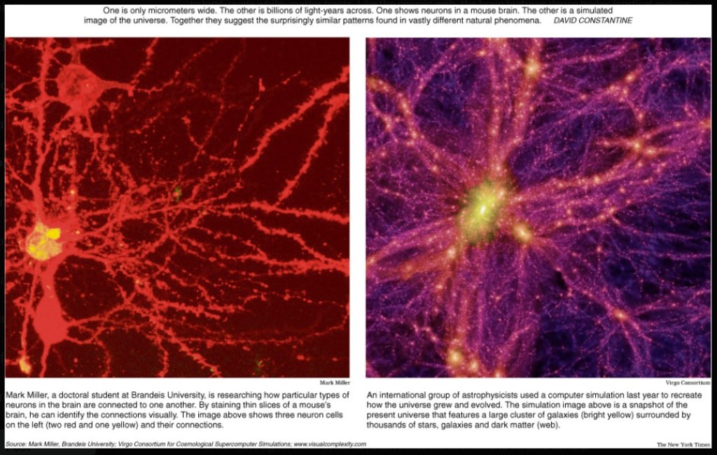 Side-by-side visualizations of brain tissue sections and cosmic web simulations underscore the visual parallels: branching filaments, clustered nodes, and expansive “empty” regions.