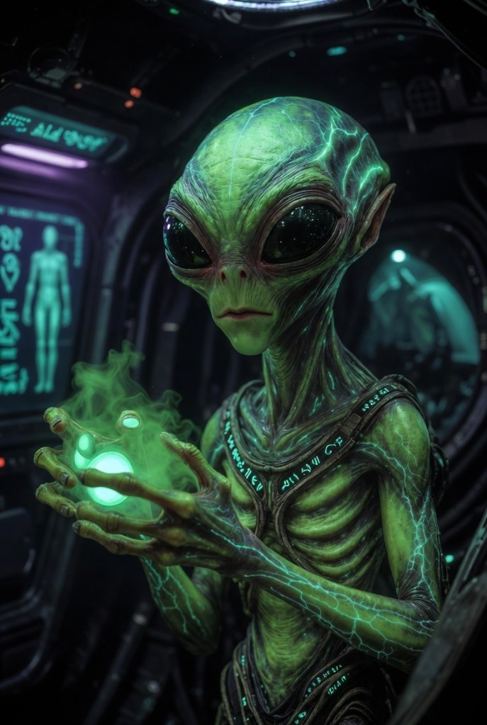 LGMs are diminutive humanoids standing only 3–4 feet tall, with bright green skin, large bulbous compound eyes, and wiry, agile builds clearly adapted to low-gravity or zero-gravity environments. They move in quick, skittering bursts and exhibit no fear of heights or open voids. Their vessels are compact saucer- or dart-shaped craft measuring 5–20 meters, with iridescent hulls that shimmer and refract light during maneuvers. These ships are extraordinarily agile, capable of hyper-precise maneuvering, rapid course changes, and scavenging operations without triggering most standard sensor alarms.