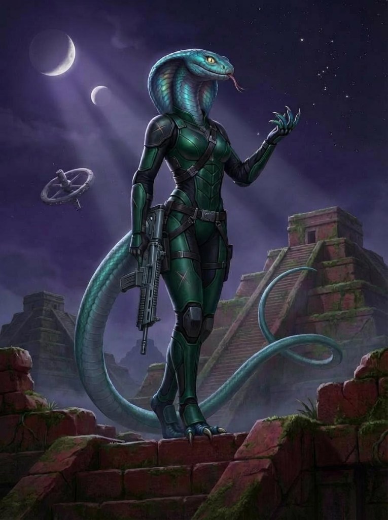 They use sleek, flattened ovoid “egg”-shaped vessels measuring 15–30 meters equipped with advanced stealth grav-cloaks that render them nearly undetectable until the moment of attack. Ophidians specialize in infiltration, long-term subversion, intelligence gathering, and surgical sabotage. They insert agents into human societies, corporations, or military units, remaining undetected for months or years before activating sleeper protocols. They have been sighted across all quadrants, often operating undercover within settlements, trade guilds, or even high-level positions.