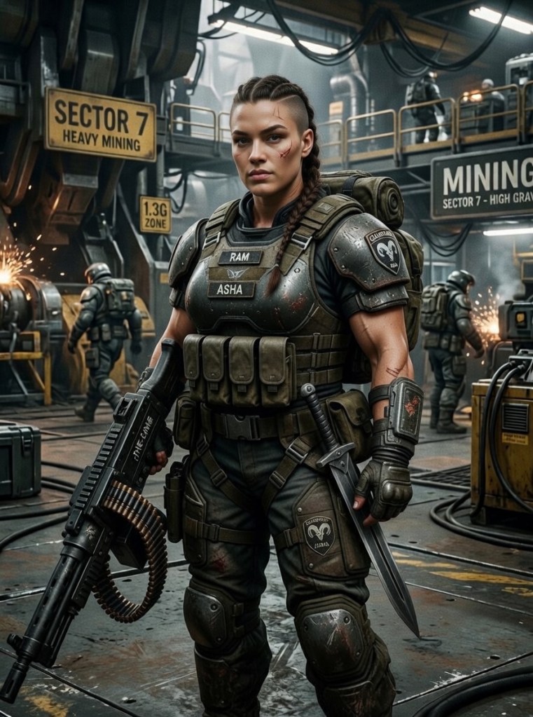 Asha “The Ram” grew up on a brutal 1.3G mining world. She became infamous as a corporate enforcer and breacher, literally ramming through sealed bulkheads and enemy positions. After being abandoned during a bad operation, she went rogue and now hires out as a heavy assault specialist to pirate crews. Short, dense, and built like a walking tank, she charges first, tanks the worst punishment, and growls orders that make enemies hesitate. Once she trusts a crew, she becomes fiercely loyal. Cross her and she’ll ram you straight into the next airlock.