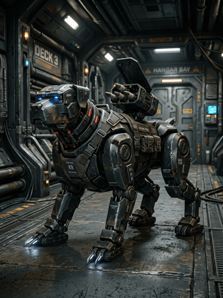 The “Rottweiler” is a fast, agile combat support unit designed to carry heavy loads (ammunition, wounded crew, salvage, or breaching gear) into and through hostile environments while remaining a lethal melee fighter. It can drop to all fours for maximum speed and stability when carrying loads, or rear up on its hind legs to engage enemies with vibro-blades or the torso-mounted carbine. The six micro-rockets provide emergency fire support or breaching capability. It retains all the utility abilities of the smaller Can bot (diagnostics, comms, repairs, data interfacing) while adding serious close-assault and load-bearing capacity. Grade 5 construction makes it exceptionally tough and reliable in prolonged combat.