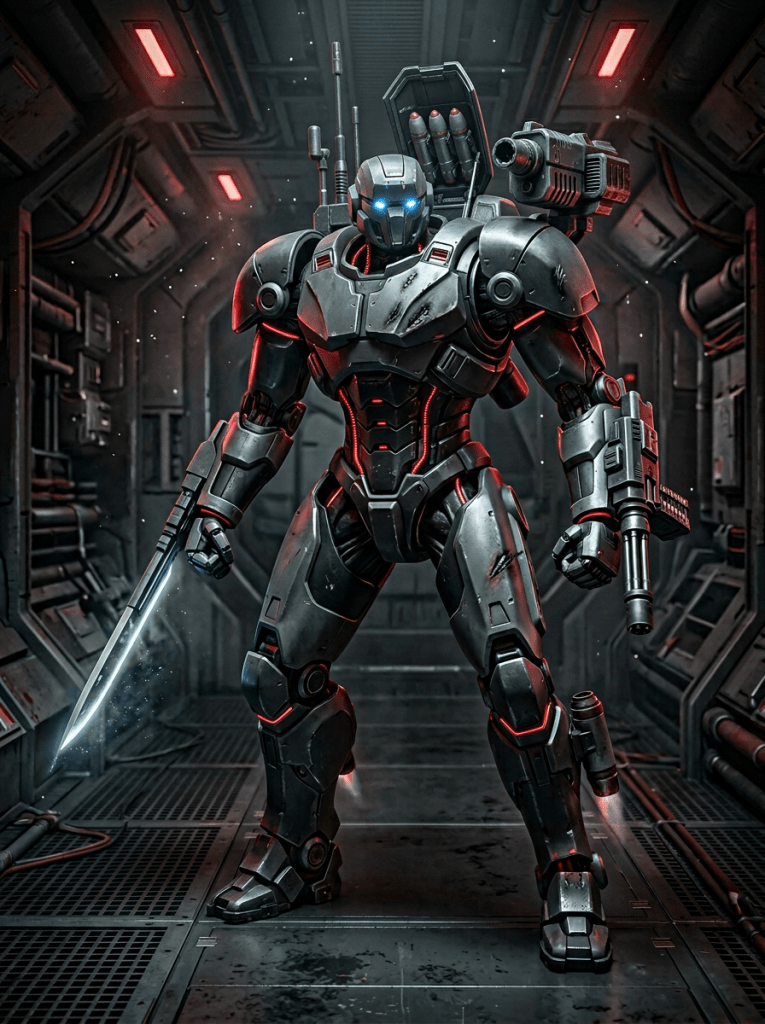 The “Spartan” is a versatile man-sized frontline combat bot designed for boarding actions, ground assaults, and close support. It can wield any man-sized weapon (rifles, pistols, bats, etc.) with full proficiency, fight effectively in melee with its retractable sword, provide suppressive fire with its forearm autocannon, deliver precise plasma beams, or launch micro-rockets for breaching or anti-personnel work. Its ankle/wrist jets give it superior mobility for jumping over obstacles or closing distances quickly. It retains full utility functions (repairs, comms, data interfacing) while serving as a durable, high-grade combat platform. Battery management is critical during extended operations.