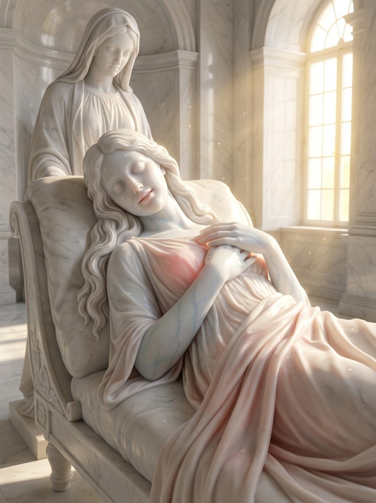 The marble was white as snow, but in its depths the veins of the lily were tinged with palest azure, and a faint flush lingered deep in its heart.
