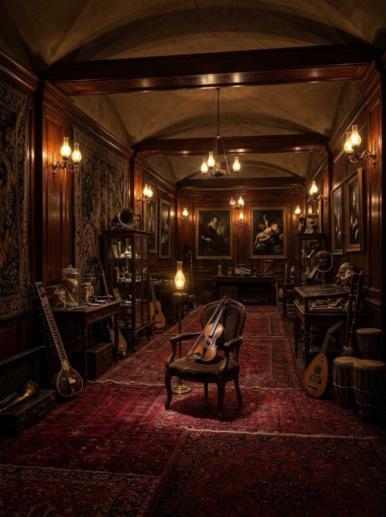 Elias took up a flute. Thin, haunting notes rose, weaving mournfully through the stuffed abominations and glass-eyed relics.