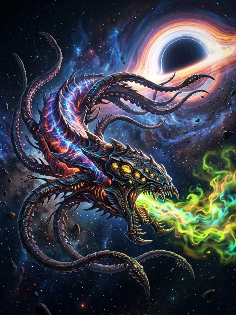A colossal (10–20 m) tentacled leviathan with a chitinous exoskeleton that faintly glows like an accretion disk. Multiple compound eyes and maw-vents that belch rad-acid mist. It moves with eerie, tidal grace in zero-G.