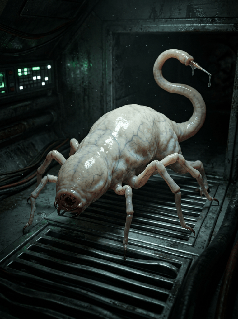 Narrative Flavor: A small, pale, spider-like creature with a long ovipositor tail. It moves with horrifying speed in zero-G, seeking warmth and soft tissue. Victims often wake up feeling violated and in terrible pain as the parasite begins its journey toward the spine. The controlled host moves with unnatural stiffness, eyes glassy, attacking former friends without hesitation.