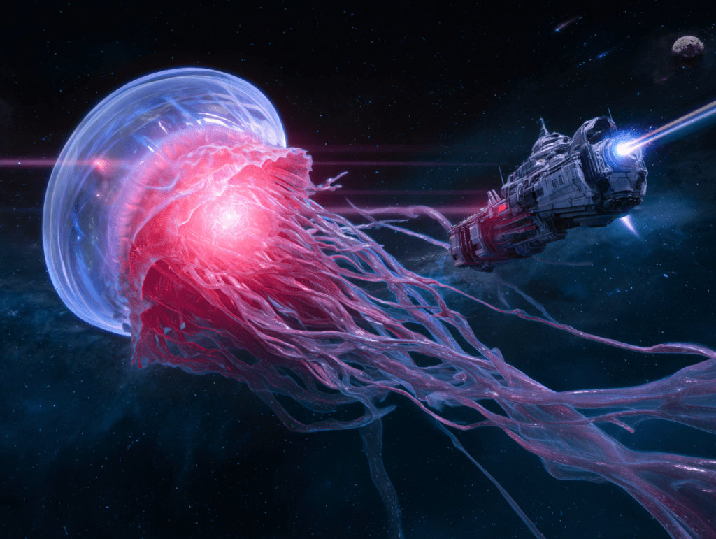 Tactics: Travels alone. Drifts toward ships, latches on with sticky tendrils, and slowly drains power until the vessel is helpless or the crew cuts it free. Larger specimens are rare but catastrophic.Narrative Flavor: A vast, glowing translucent mass the size of a small asteroid, pulsing with stolen energy. Tendrils longer than cargo pods wrap around the hull while the ship’s lights dim and systems fail one by one.