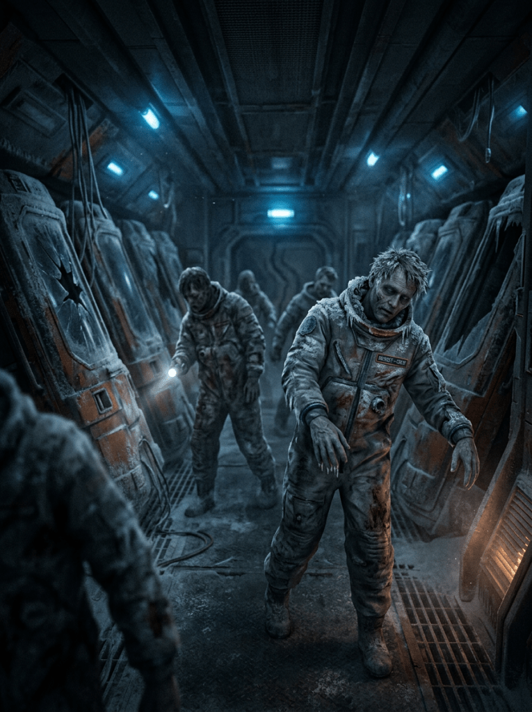 Frozen colonists or crew whose cryo-pods failed centuries ago. Radiation and failed preservation have turned them into slow, mindless things driven only by hunger for warmth and living tissue. They are not undead in a supernatural sense — just biologically ruined, still moving because the virus keeps the nerves firing.