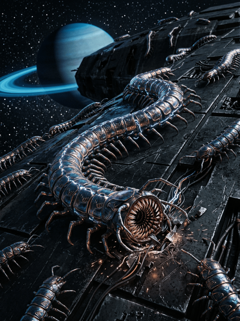 These silicon-based scavengers drift through deep space, feeding on metal, wiring, and electromagnetic fields. They resemble metallic centipedes or lamprey eels with segmented iridescent bodies, dozens of hooked legs, and a circular maw lined with diamond-hard teeth capable of chewing through cerametal plating.